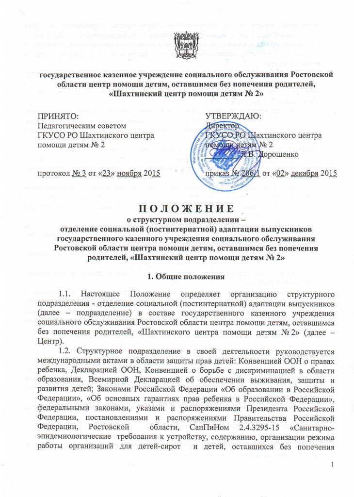 1.7. В структурном подразделении ведется документация согласно номенклатуре дел ГКУСО РО области центра помощи детям, оставшимся без попечения родителей, «Шахтинского центра помощи детям № 2» .